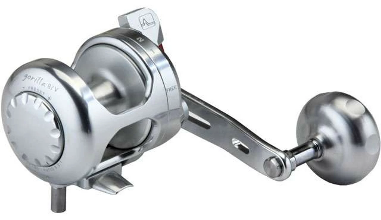 The Alutecnos Gorilla 8V conventional reel is small, compact and light, a perfect reel for those who love vertical jigging. The integrated drag pre-set and drag side plate has an ergonomic design for the utmost comfort during fishing action. A longer operating lever combined with the aluminum power handle generates considerable power to better exploit the fast retrieve ratio (6.2:1). With only 580 grams/20.45 oz of weight, the Gorilla 8V maintains all the other mechanical characteristics that have made famous the Gorilla 12, 12C and 20 reels.