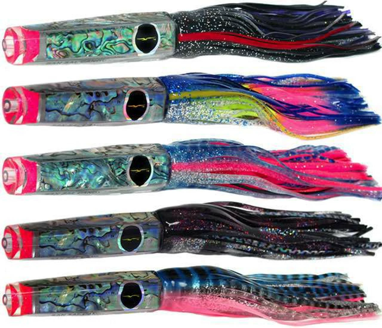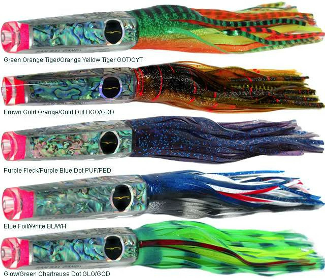 Black Bart Lures San Sal Candy has a tapered body, narrow cup nose and hex back. San Sal Candy is a deep swimmer with ultra realistic motion that can be trolled at all speeds. San Sal Candy trolls extremely well at high speeds, so Wahoo look out. Troll with 300 lb. mono or cable leader depending on your target fish, i.e. Bluefin Tuna, Yellowfin Tuna, Big Eye Tuna, Blue Marlin, Wahoo, Dolphin, Stripe Marlin, White Marlin.