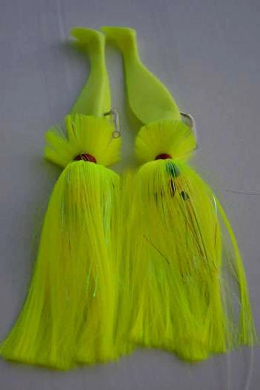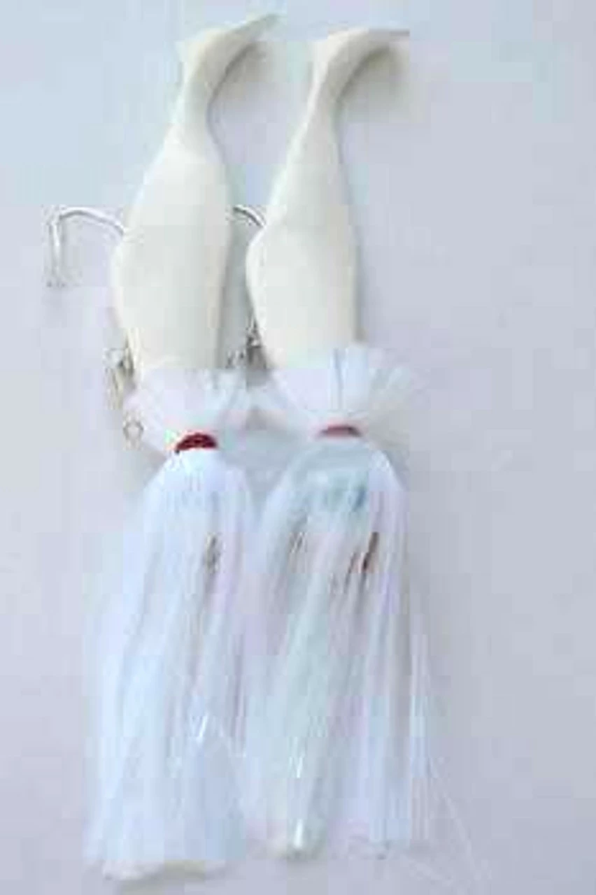 The Blue Water Candy Tandem Parachute Rig features 3/0 with 3-way swivel with a 14′ and a 4′ 100# mono leader attaching to coastlock swivels. Loaded with 9″ shad and parachutes.