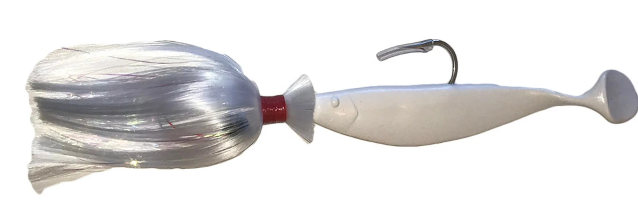 The Blue Water Candy Swinging Gus Mojos Loaded with 9? Shads are striped bass candy. Available in 20oz, the Swinging Gus features beautifully painted lead heads with large bubbly eyes, and the finest nylon fibers along with mylar accents for some extra flash. Its 12/0 free swinging Mustad duratin saltwater hook promotes solid hookups to keep you tight on a cow bass. Hand tied in the USA, you will be hard pressed to find a better loaded mojo lure regardless of whether you are fishing in the northeast for stripers or fishing down south and happen to call them rockfish.