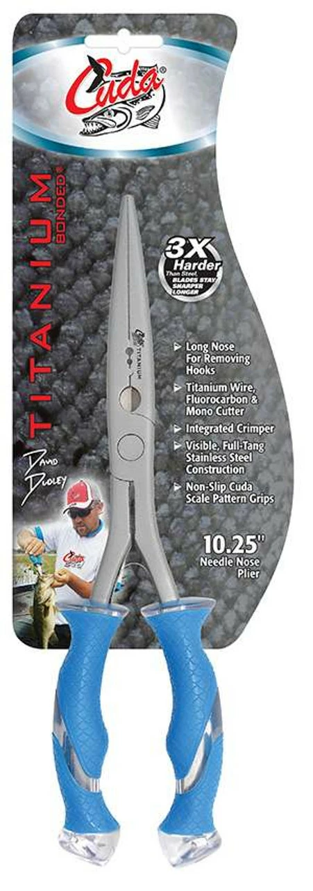 Cuda 10.25″ Titanium Bonded stainless steel freshwater long needle nose pliers are ideal for removing hooks with integrated crimper and long nose. These pliers are made with full tang carbon steel construction and non-slip grips. They feature titanium bonded stainless steel blades that stay sharper and are 3 times harder than steel.