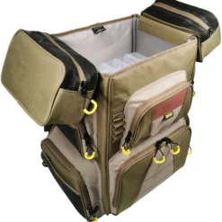 The Evolution Outdoor 5007 Flambeau Heritage Backpack holds up to six 5007 Flambeau Utility Boxes with Zerust Dividers. This backpack features an internal fold out saddle bag style zippered storage, an external zipper pocket, side pocket line spool feed, padded carry straps, and a double G-Hook closure.