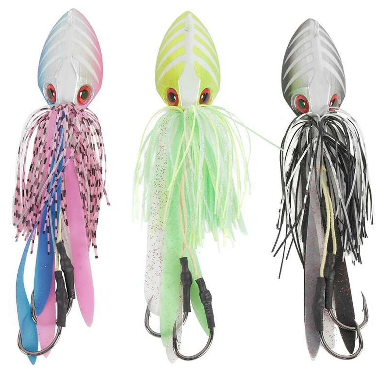 The OTI Flayer Jig is perfect for coaxing bottom dweller out of the reefs and wrecks. The head section features metallic paint with glow-in-the-dark features and red 3D eyes. The multiple length skirts gives an irresistible action on the drop and fall, it also conceals the double Raptor Assist Hooks for a more natural look.