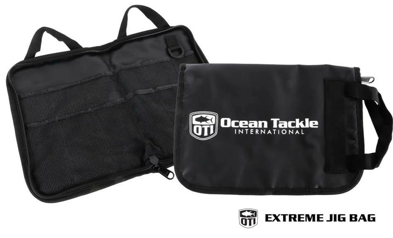 The Ocean Tackle International Extreme Jig Bag is a smaller more compact version from the previous model. The internal D-Ring is perfect for attaching a pair of split ring pliers on a lanyard to. The two external pockets are perfect for keeping your terminal tackle organized. This Extreme Jig Bag is built tough and designed for your everyday jigging needs. This bag can withstand anything you can throw in it.