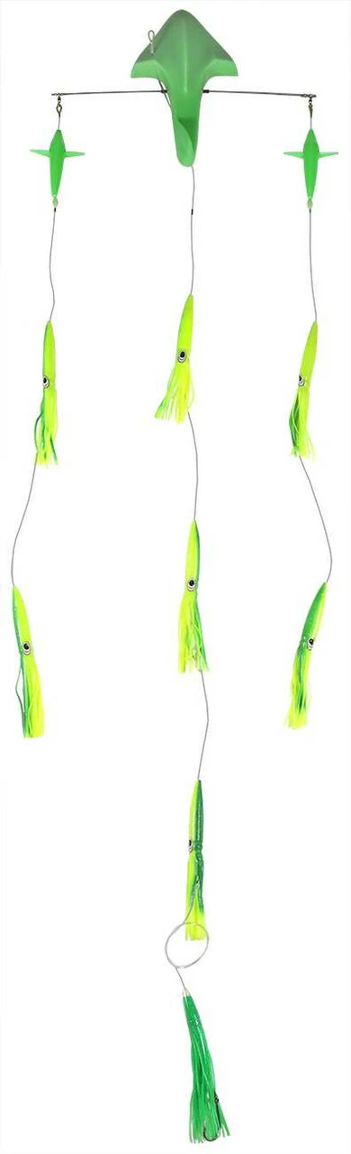 Increasing the width of your spread to ensure you’re covering the maximum amount of water, the PlayAction 18in Outsider Tracker Bars are a must have for those looking to maximize bites while trolling. These directional spreader bars are built on a 1/8in diameter stainless steel bar with an oversized 12in directional bird at the center. The bird rigs the center line in such a way that causes the bar to track outward in either the port or starboard direction. This feature allows the bar to run in a more visible location in the clean water outside the prop wash. The use of both a port and starboard side wide tracker bar can greatly increase the overall width of your spread and make room for you to run additional lines. The center and wing lines are rigged with two 5in Humming Birds and seven 9in blub squids to attract fish to the spread by simulating schooling bait skittering across the surface. The 9in Machine Stinger rigged with an 8/0 heavy duty southern tuna hook seals the deal once the fish are in range. All connection points are professionally crimped with chafe gear for maximum reliability. Each spreader bar comes with its own clear vinyl/mesh lure bag for easy storage and wash down.