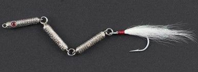 The Jointed TC Sandeel weighs 2.6 oz. and the metal length is just under 6 in. This silver lure is designed to be dragged in the sand making a *puff* of sand which a hungry striper will think is a sandeel trying to hide. It can be cast and retrieved through different levels of the water column as well, and with a little rod twitching the Jointed TC Sandeel will have much flash and attraction.