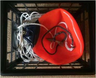 The Harpoon Line and Ball Kit is a complete kit that includes 150 ft of 5/16 spliced nylon rope with spliced loops on either end for easy of connection. It also includes a A-1 poly ball and square crate to hold the line and ball also included is a spliced line with a Shoals Dart.
