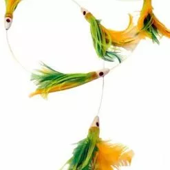 Our Sportfish Feather Chain features 5 feather lures rigged on 200lb test mono. This chain is always an inshore and offshore favorite by anglers everywhere. Albacore, Tuna, Mahi, Wahoo and other Pelagics cannot resist the action of these feathers. All of our trolling chains come with a free lure bag included.