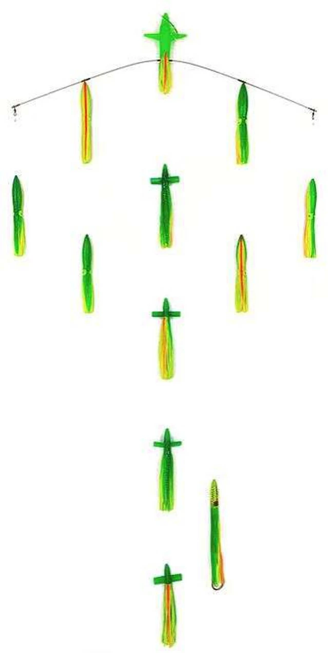 Named for the heavy surface commotion and noisy racket it produces, the Sterling Tackle 36in Chaos Tracker Bar w/ 9in Bulb Squid is among the deadliest directional spreader bars you’ll ever pull. Built on a .125 inch diameter high grade titanium bar, these pre-rigged spreader bars are loaded with the perfect combination of soft birds, squid, and rigged stinger to attract pelagics like tuna, dolphin, billfish, and more to your spread. Fitted under the lead bird is a plexiglass keel that causes the bar to track as much as 30 ft. outward from its normal tracking line. This feature allows the bar to run in a more visible location in the clean water outside the prop wash. The center line is loaded with four 9 inch soft rattling birds for extra noise and surface splash, while the wing lines feature a total of six 9 inch bulb squids to simulate schooling bait. The rear squids are even fitted with rattles of their own to really ramp up the noise factor. Inside the bottom teaser bird is a 400lb stainless bearing swivel used to attach the 12in Mini-Machine Stinger rigged with tri-beads and a 10/0 4x strong knife edge big game hook. The center line is rigged with 250lb smoke blue Momoi monofilament, while the wing lines are rigged with 200lb. Loop protectors are used on all critical connection points. Each spreader bar comes with its on clear vinyl/mesh lure bag for easy storage and wash down.