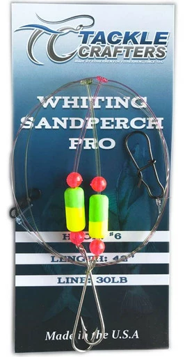 The Tackle Crafters Whiting Pro Rig features two #6 long shank hooks and quad color mono leader. This product is made in Jupiter, Florida.